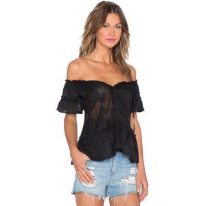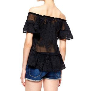 For Love & Lemons "Pina Colada Top" in Black, size XS. Sold out everywhere! SUPER flattering on. Dolls Kill description: "Yer ready to pour up with this off-the-shoulder top that's showing yew off fer the sun. Constructed from a semi sheer knit with a floral burnout design. With its loose ruffle tiers on the sleeves and hem, this flirty BB has a front tie and button closure. Supa breezy with its lightweight and silky smooth construction."