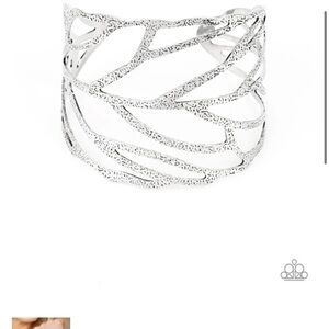 Hammered in rustic details, an airy silver feather wraps around the wrist, creating a seasonal cuff.