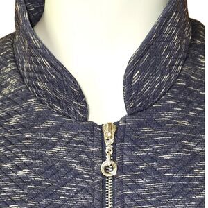 You're purchasing a new without tag women's plus size blue and white speckled jacket size 46= 2x No damage, has been washed, due to being in storage. Material is 70% polyester, 27% viscose, and 3% elastane. Wash with same or similar colors in cold water, close zipper and wash inside out, iron inside out, tumble dry low. All measurements are approximate and I don't accept returns for approximate measurements Thank you. On wash tag it says 46. I couldn't find anything else that indicated the size, but the bust measurement is 46" and that is a 2x. The length is 30". If you know your measurements and your sizes you will understand how I came to the indication it is a 2x. Please make sure to read my above disclaimer in photos Thank you.