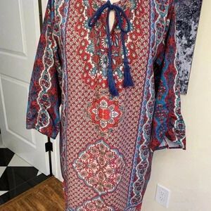 This dress is a loud floral print that ties at neck with blue tassels. Small. 3/4” sleeves that ruch at the bottom. Silky soft. Poly. Fits true to size. Slips over the head. Lots of bold colors! NWOT from my nonsmoking home. Boho hippy. 19” pit to pit. 32.5” length.
