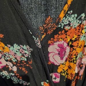 Gorgeous black romper with colorful bunches of flowers all over it. This romper does have a beautiful cut to the sleeves that allows for a really nice detail.