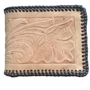 Tan and dark brown Braid trim Sections for cards and cash Firm not supple Gently used. Some marks. Price reflects wear
