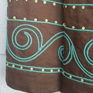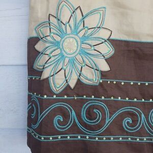 Neutral Colors of Tan & Brown With Turquoise Stiched Floral Design. Embellished with Sparkly Sequins & Beads