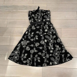 Floral embroidered strapless fit and flare dress in size small. Size back closure. Has waist tie ribbon detail. Knee length. Gently used.