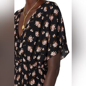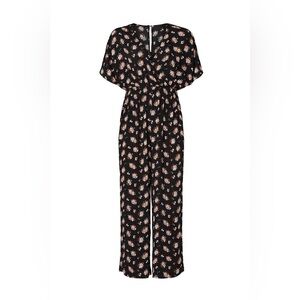 Black and white floral printed crepe (100% VIscose). Jumpsuit. Short sleeves. V-neckline. Wrap tie closure. Inseam: