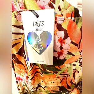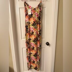Vibrant floral maxi dress with a tropical print. Features shades of pink, orange, and green.