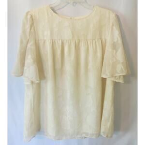 FLORAL OVERLAY Top Flutter Sleeves Size L Women Short Sleeve Lined Cream Boho