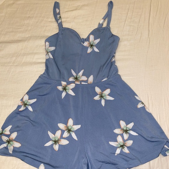 light blue floral romper with an open back
