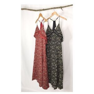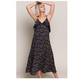 Floral Ruffle Maxi Dress Featuring Black Base with Ivory floral print. Designed in a maxi relaxed fit with Flowy Ruffle Detail On Bust And Back with Lace Trim sewn on edge, Low V- Neck Line with Adjustable traps , and finished with zipper closure on back.