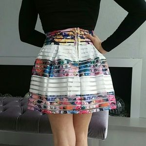 BRAND NEW Gorgeous floral print with white stripes skirt. Rows of floral elastic, white elastic and clear fabric make this skirt a true statement maker. White lining Size small zip up in back Material 80% polyester 20% elastic (skirt is semi stretchy) *Juniors/ petite fit in my opinion*
