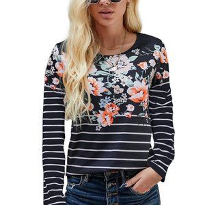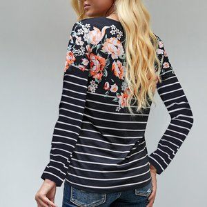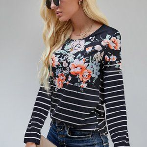 FLORAL STRIPED PRINT BLACK LONG SLEEVE TOP