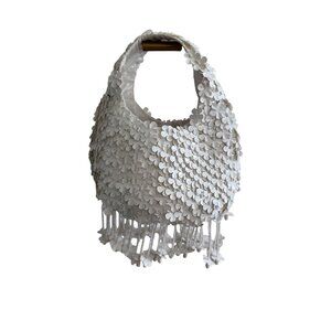 This elegant white handbag features intricate floral appliqué and a sophisticated beaded fringe, making it a stylish accessory. The interior provides ample space for essentials, while the secure closure ensures items remain safe. An ideal choice for those seeking both elegance and functionality in their accessory collection.