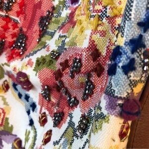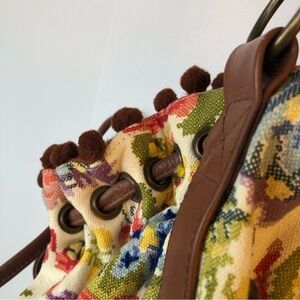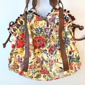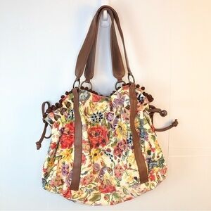 FLORAL canvas large tote bag Pom pom trim embellished artsy lightweight