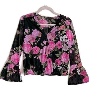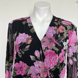 FLORAL wrapped Blouse Top SMALL long Bell Sleeves Black Pink Purple NWT