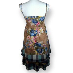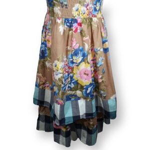 FLORAL BEIGE SUN DRESS SZ. S/M NWT. GORGEOUS DRESS IN EXCELLENT NEW WITH TAG CONDITION. BLUE & PINK FLORAL PATTERN WITH PLAID AROUND BOTTOM.