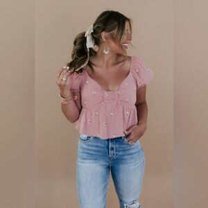 The Floral Moment Blouse is crafted with a cropped fit and is accompanied by embroidered floral detailing and short puff sleeves. Such an ideal blouse for the season!