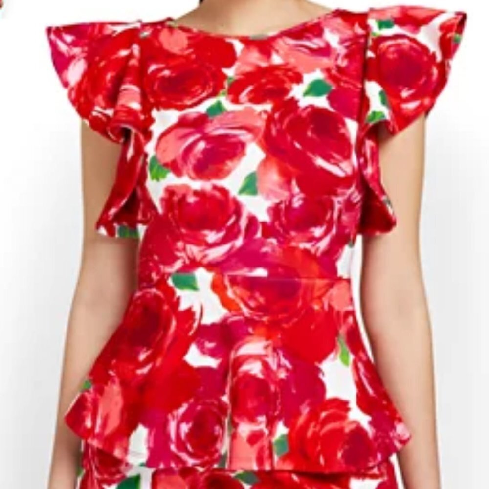 The epitome of feminine style, this knit top is rendered in a bold feminine print with a flattering silhouette defined by ruffle sleeves and a peplum hem.