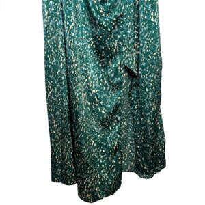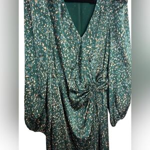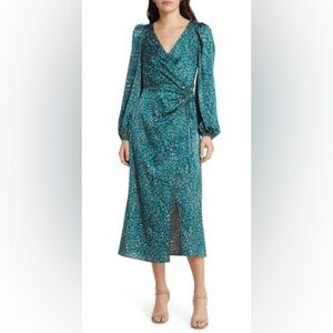 FLORET STUDIOS Elegant Long Sleeve Satin Faux Wrap Midi Dress Size Medium Green