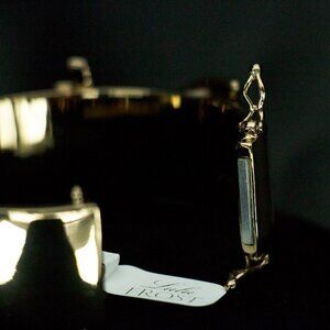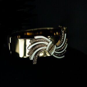 *** UNABLE TO FIND ELSEWHERE *** Stunning! This shiny gold tone hinged cuff bracelet focal point is an enameled white & gold colored bow adorned w/glass crystals. The clasp has a strong magnet with a safety clasp on top and bottom edges. It is a gorgeous piece that would complement the Deco Shell Jane Gold necklace and earrings. A display piece, bracelet measures 2.5" x 3/4 high & may show slight wear. You will receive the item pictured in a soft velvet Lulu Frost gift pouch.