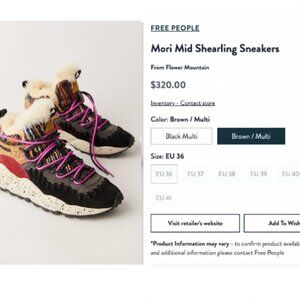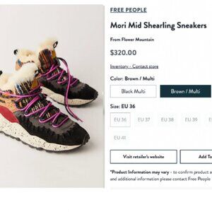 Free People x Flower Mountain Mori Mid Shearling Sneakers Black- Size EUR 38 = U.S. Size 7- 7.5