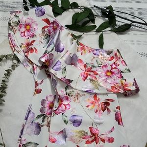 FLOWER PRINT ONE SHOULDER RUFFLE MIDI DRESS