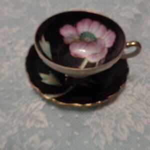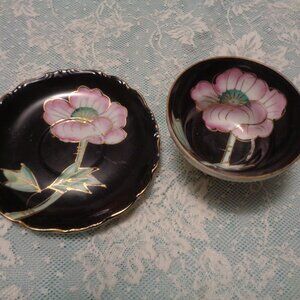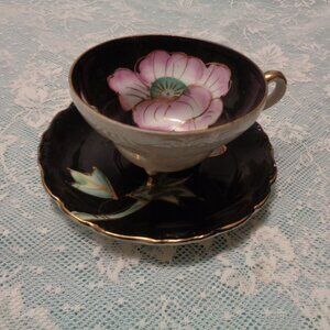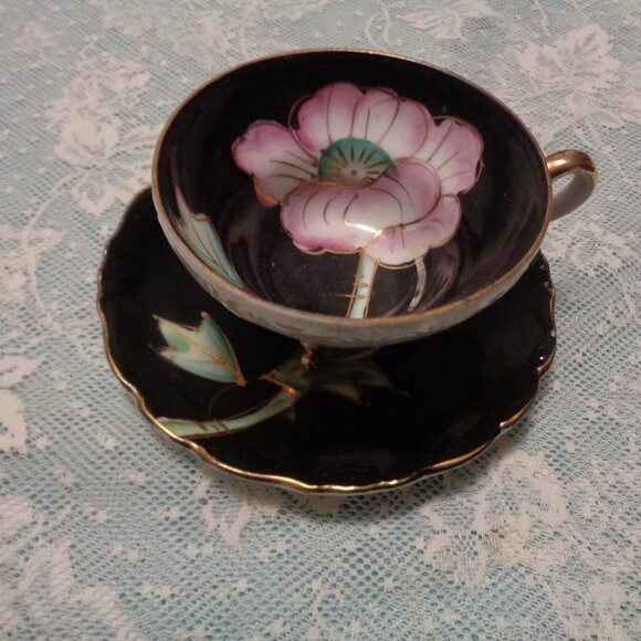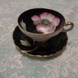 FLOWERS VINTAGE ASIAN STYLED PORCELAIN IRIDESENT CUP & SAUCER BLACK PIN…