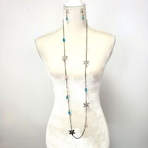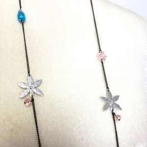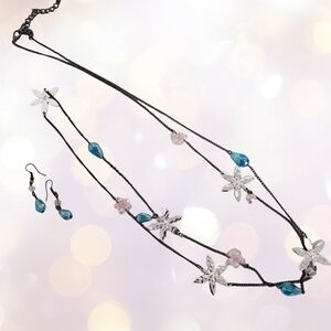 FLOWERS and Beads Necklace and Earrings Set in Silver Blue Pink