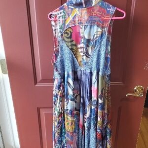 Vibrant maxi dress with abstract patterns. Sleeveless design. Perfect for a bold look.