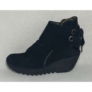 The FLY London YEBI Blue Suede Back Tie Closure Ankle Wedge Heel Booties in size 37 are stylish and comfortable women's shoes perfect for city wear or casual outfits. These booties feature a solid black color with an almond toe shape and a mid-height wedge heel, making them versatile for various occasions. The back tie closure adds a unique touch to the design, while the suede upper material sourced from India ensures quality and durability. The Fly London brand is known for its trendy and fashionable footwear, making these booties a chic addition to any wardrobe.