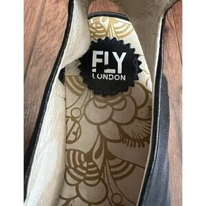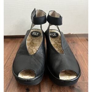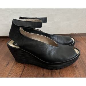 FLY LONDON Yala Black Leather Peep Toe Wedge Ankle Strap Sandals Shoes Sz 39