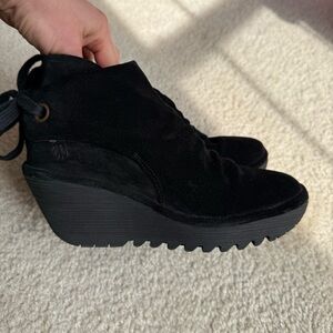 FLY London Black Suede Yebi Ankle Boots Tie Back Size EU38/US7.5. In great preowned condition. Let me know if you have any questions