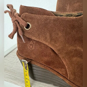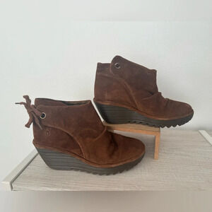 FLY London Suede Ruched Ankle Wedge Boots Tie Detail Comfy Boho EU 40 US 9 READ