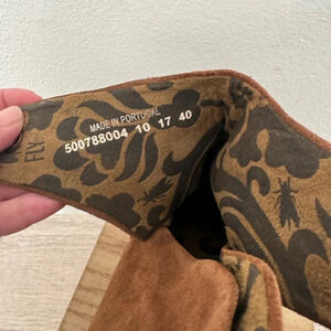 This is a listing for a pair of preowned FLY London Suede Ruched Ankle Boots with Tie Detail Yebi Brown EU 40 US 9-9.5. One shoe is missing a lace in the back, could easily replace with a new set. Otherwise good condition, light wear. Please see all photos for details as they are part of the description.
