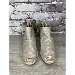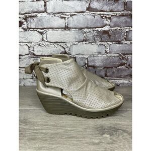 FLY London Yake Pearl White Leather Perforated Back Lace Wedge Sandals Women 38