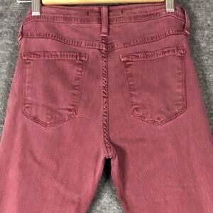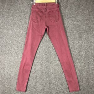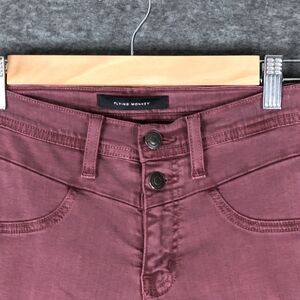 These Flying Monkey juniors skinny jeans in size 26 feature a red color with a stretch fabric type. They have a mid-rise and a slim fit, with a zip and button closure. The jeans have double buttons as accents and two rear pockets. The inseam is 31 inches with a waist of 27 inches. Made of a cotton blend stretch denim material, these Flying Monkey jeans offer a colorful and stylish and comfortable option for young women.