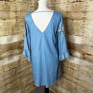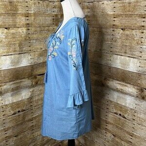 FLYING TOMATO FLORAL EMBROIDERED CHAMBRAY COASTAL WESTERN PASTEL BOHO DRESS MED