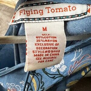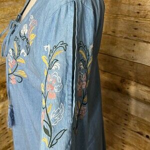 FLYING TOMATO FLORAL EMBROIDERED DEEP PLUNGE, BELL SLEEVE, CHAMBRAY TUNIC TOP/ MINI DRESS WITH SLITS AT THE BOTTOM HEM OF SHOULDERS TO SHOW TOP OF ARMS. FRONT NECKLINE LACES UP WITH TASSELS ON THE END OF LACES. NO FLAWS. SEE PICS FOR MATERIAL TAG. OFFERS WELCOME.