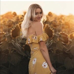 Yellow floral printed crepe (100% Rayon). Maxi length. Short flutter sleeves. Off the shoulder neckline. Hidden back zipper with hook-and-eye closure. Partially lined. Made in the USA. Size medium. Approximate measurements: 34” bust, 27” waist. Light color transfer at neckline, wear to back hem (pictured).