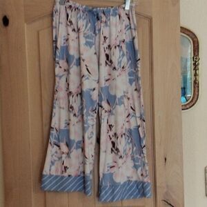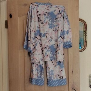 Pajamas to sleep or lounge in. Super soft fabric Top has contrasting trim. Bottoms have elastic with drawstring and are a cropped length with the same contrasting trim. Size S measures: 26-40 at waist, 44 at hips, pockets here. 9.5 rise, 24.5 inch inseam. Very soft and comfy.