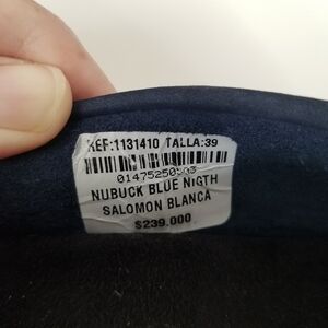 Blue suede with white stitching details.