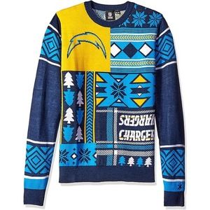 FOCO NFL Patches Ugly Sweater Team : Los Angeles Chargers Size : Small FOCO NFL Patches Ugly Sweaters are known for their comfort, warmth, and value. They are made with good quality material and are perfect for fall and winter. Reviewers also like the fit of the sweater.