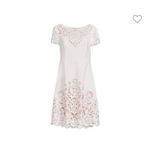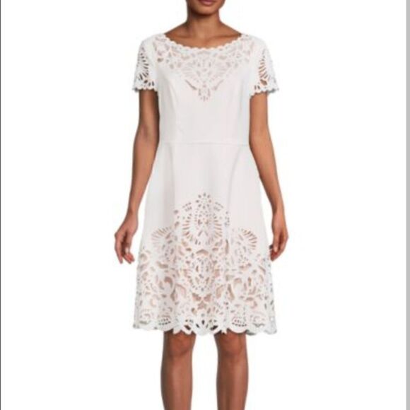 Timeless dressing at its finest, this workwear dress transitions seamlessly from work to a day party. It boasts textural delight with a laser-cut overlay and scalloped trims.