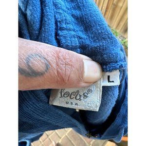 Focus USA indigo blue cotton gauze vest with corduroy hood and trim. quilted in a floral design. Zip closure, front pockets.