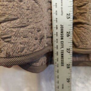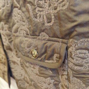 FOCUS Womesn XL Jacket Barn coat, Grannycore, Retro, Embossed Tapestry looking, Soft Shell Background is dark gray small plaid with embossed lighter grey floral and scroll work design, Button, Warm jacket without being Heavy, Flannel Lined embossed throughout, Peter Pan Collar Bronze looking button close and on patch Pockets to close flaps.