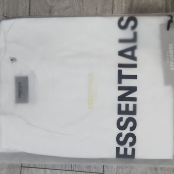 White Fear Of God Essentials shirt with front letter and logo on the back