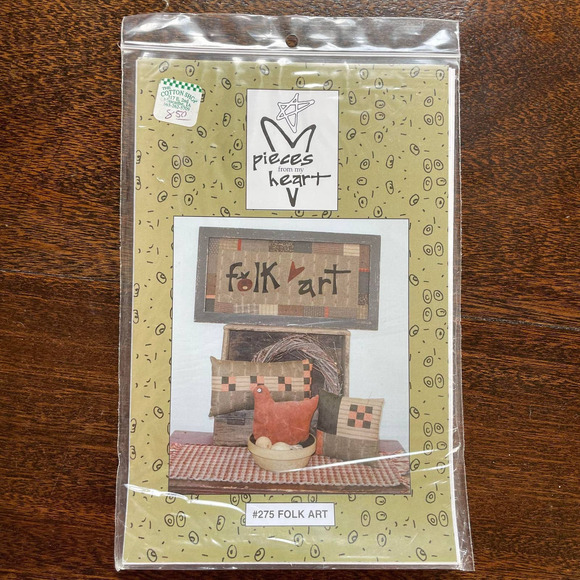 It includes a set of 3 patterns. 1 for a long pillow. 1 for a square pillow. 1 for a framed picture that reads "folk art".