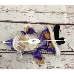 This is a folktails puppet in the shape of a wizard. It has a white beard and a purple robe. It also has a purple wizard hat. The robe has crescent moons and stars on it.