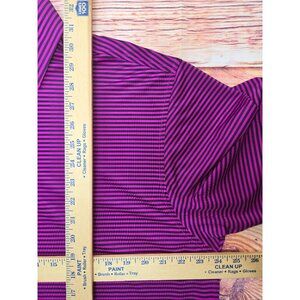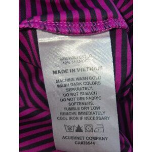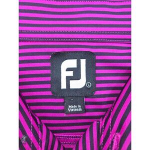 This Footjoy polo shirt offers a stylish design with purple and black stripes. Crafted from polyester and spandex, it ensures comfort and flexibility.
