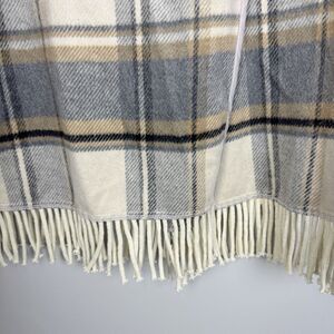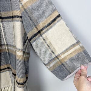 Stunning and super classy cape style jacket by For Cynthia. Neutral plaid print – gray, black, cream, and tan. 3/4 length sleeves. Cream fringe detail along the bottom. Brown belt style buckle near the neck line. Snap closure. Brand NWT. Women’s size extra large (xlarge, X-large).