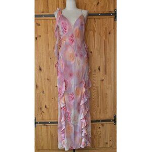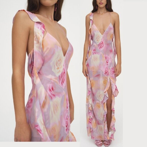 FOR LOVE AND LEMONS BEATE RUFFLE PINK MAXI DRESS IN BLURRED ROSE PRINT S